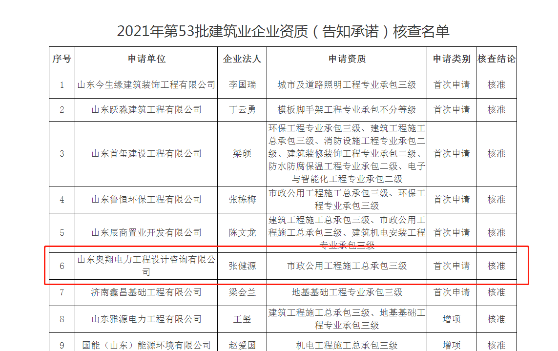 近日,濟南市行政審批服務局發(fā)布《關于2021年第53批建筑業(yè)企業(yè)資質(zhì)(告知承諾)核查名單的通告》,山東奧翔電力工程設計咨詢有限公司獲得由濟南市行政審批服務局頒發(fā)的電力工程施工總承包三級資質(zhì)。
